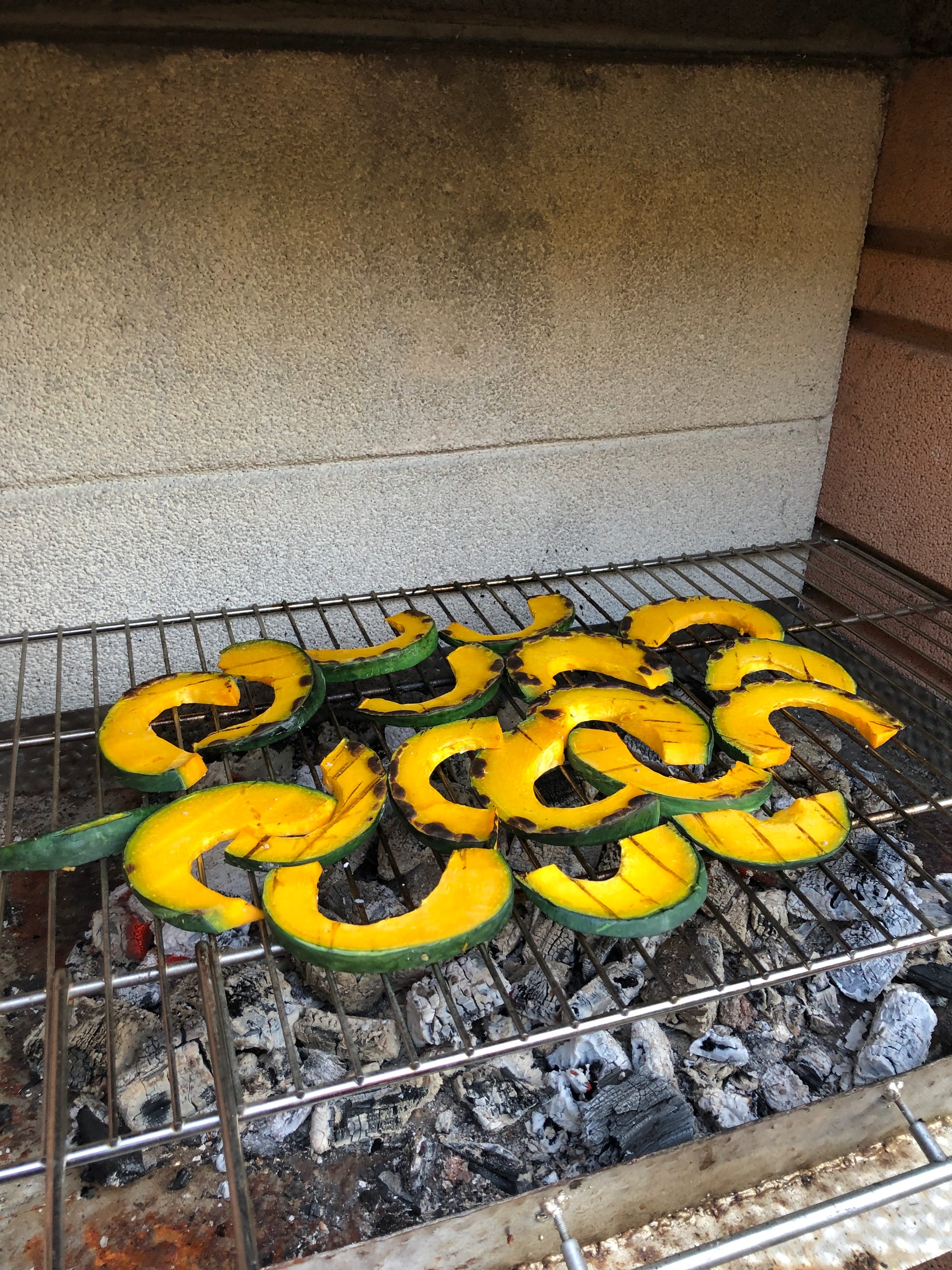 (左)義理父がブルガリアで育てたかぼちゃ。(右)ブルガリアでかぼちゃをバーベキューした様子。美味しそう!(L) Beautiful Japanese pumpkins grown in Bulgaria by father-in-law. (R) Barbecued pumpkins in Bulgaria. Looks delicious!