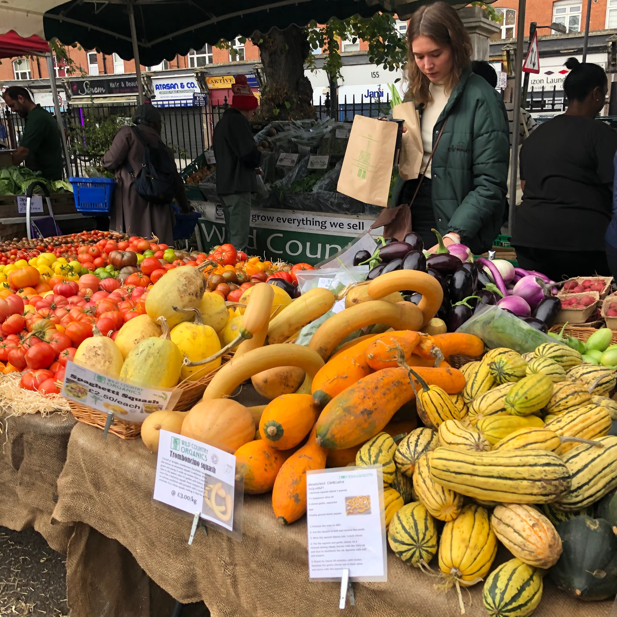 (左)エディンバラの食料品店で見つけたこのかぼちゃはブラジル産。(右)マーケットではたくさんの種類の西洋かぼちゃが並んでいてきれい。(L) This pumpkin which I found in a local grocery shop is from Brazil. (R) Many kinds of beautiful pumpkins in a farmer's market.