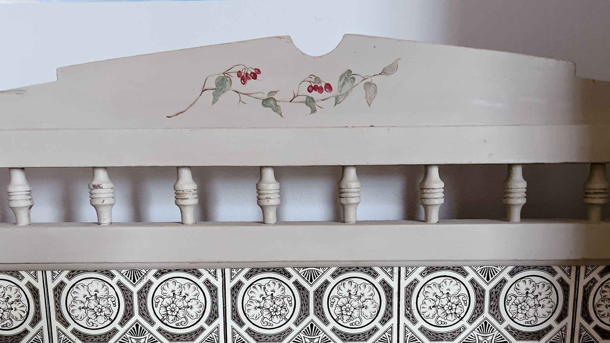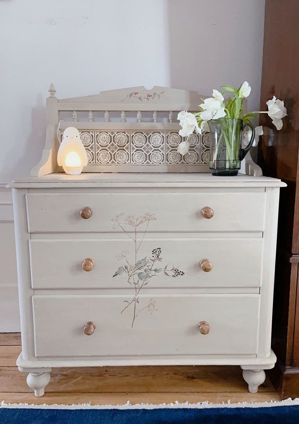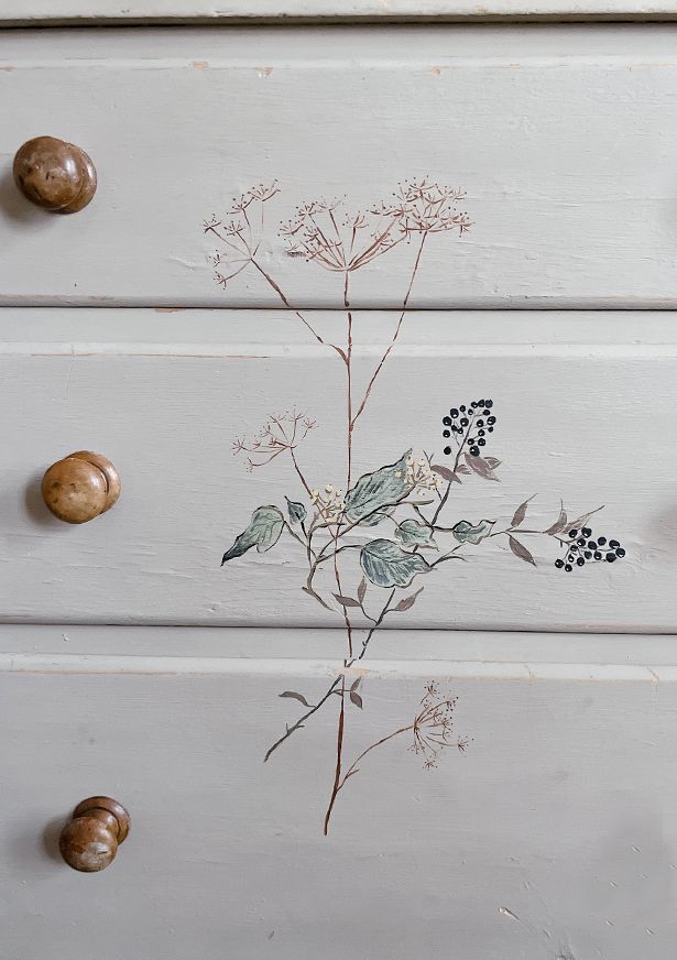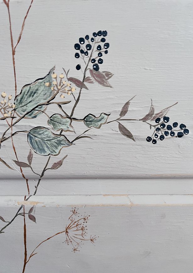 家に帰っても忘れられないそのチェストは、やや小さめサイズで、表面はクリーム色にペイントされ、暖かみがありました。その上に細い筆で植物が描いてあり、なんだかとても品がありました。