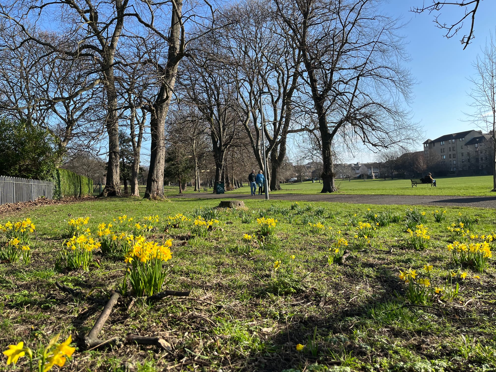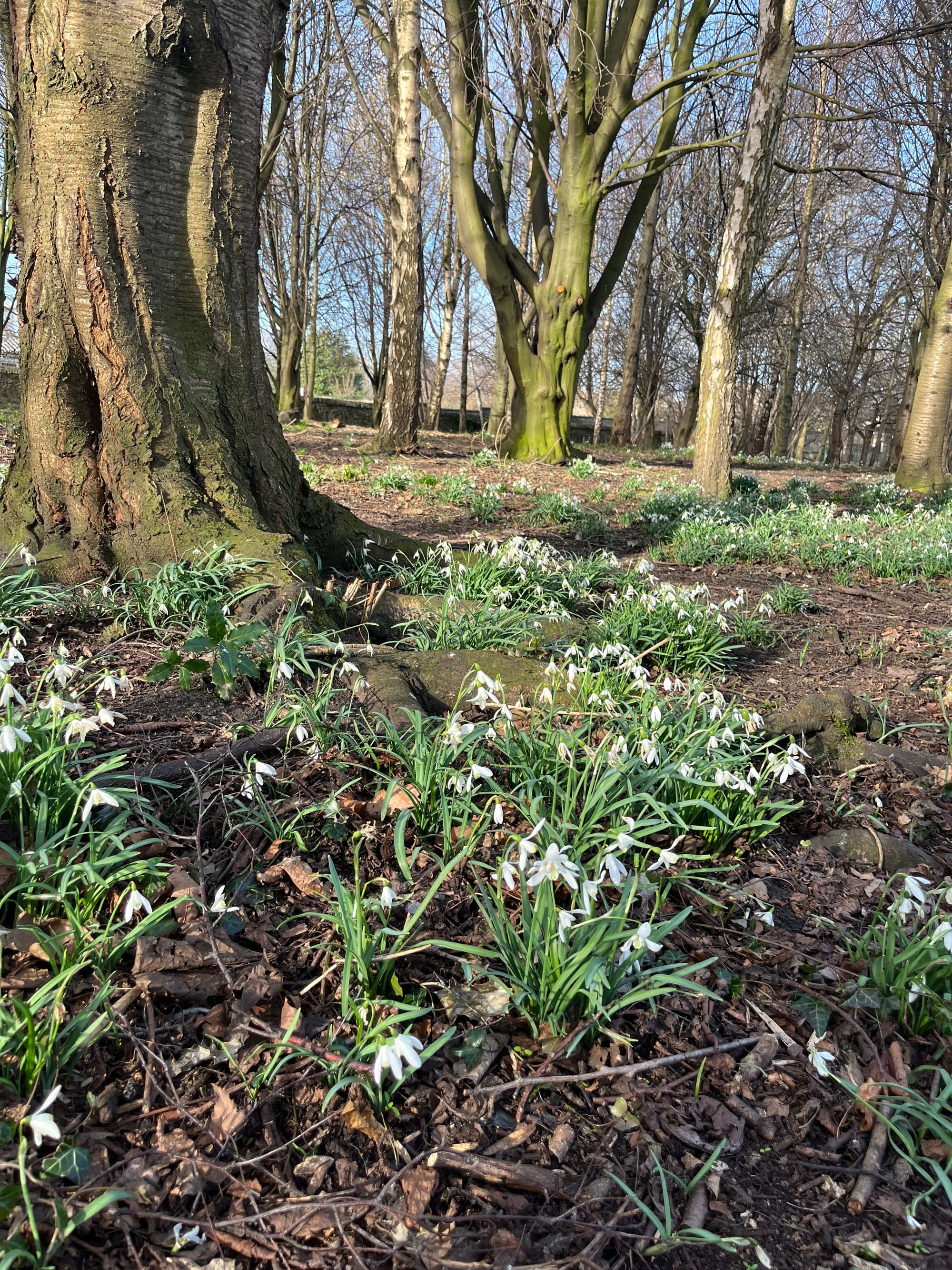 公園で白く咲き誇るスノードロップ(Snowdrop)、鮮やかな黄色い水仙(Daffodil)、紫色のクロッカス(Crocus)