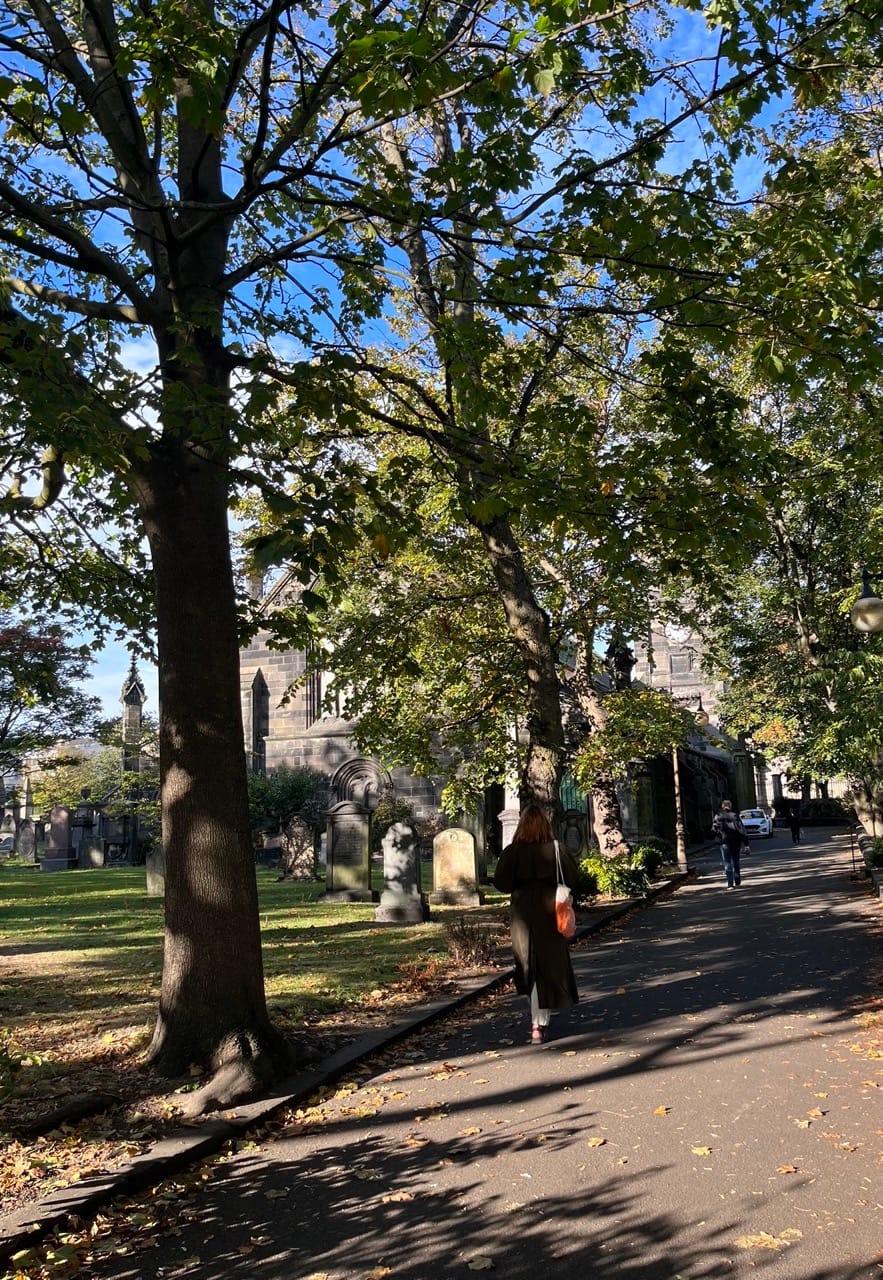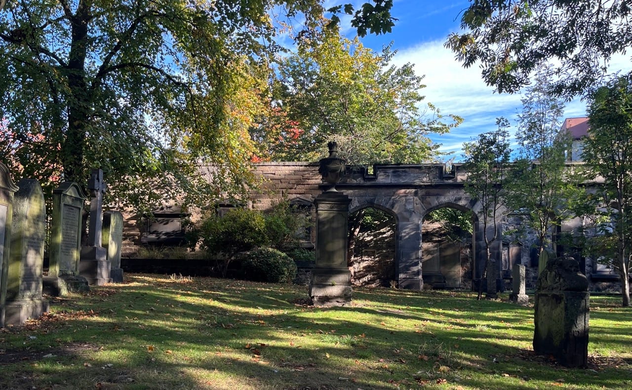 散歩道の墓地と公園。秋晴れで気持ちのいい朝。The cemetery and park along our morning walk.A crisp autumn morning with clear blue skies.