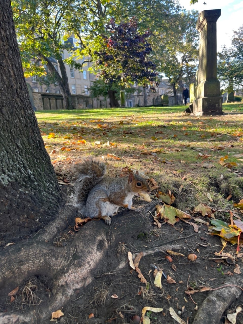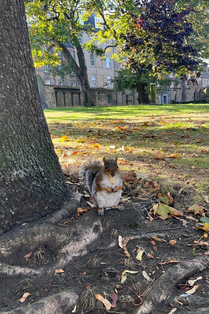 Our favourite place to see squirrels lately is a quiet cemetery next to an old church. Unlike the tidy and orderly cemeteries in Japan, cemeteries here are more natural — filled with wild grass and moss-covered stones that blend beautifully with the surrounding nature. There’s a peaceful, almost poetic atmosphere about them.