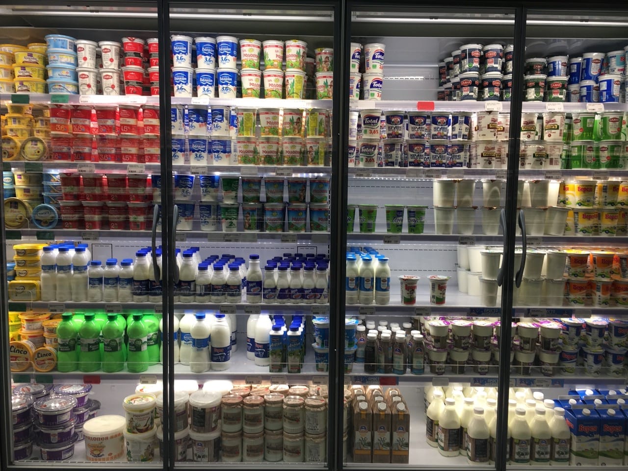ブルガリアのスーパーマーケットのヨーグルトコーナー。塩入りの飲むヨーグルトも人気です。The yoghurt refrigerator in a Bulgarian supermarket. Salted drinking yoghurt (ayran) is also a local favourite.